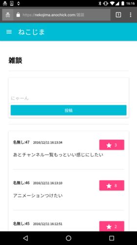 https://nekojima.anochick.com でーきた。 特徴としては↓ リアルタイムチャット(勝手に更新が反映される) チャンネルの作成が自由にできる。 無限にふぁぼれる 完全匿名 です。 ふぁぼり放題です。 作り方の解説 anoninoni.hateblo.jp こっちでも雑に書い…